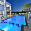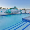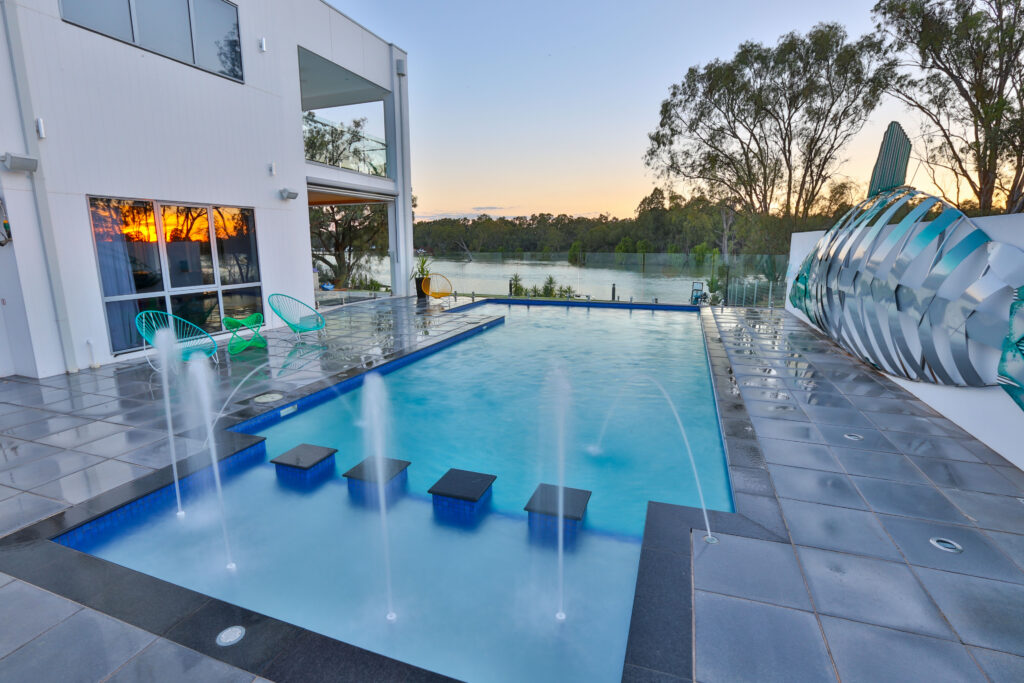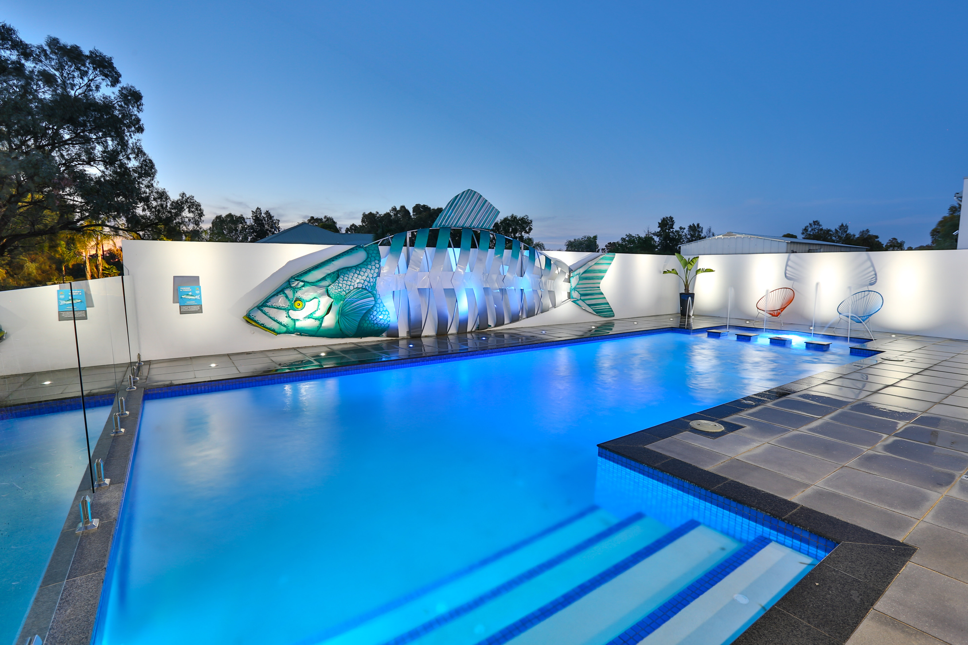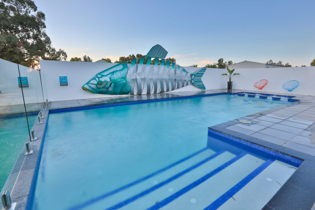 Cast a line and you may pull the catch of the day! Lighting and water features come to life at night to create a tranquil air of colour and sound.