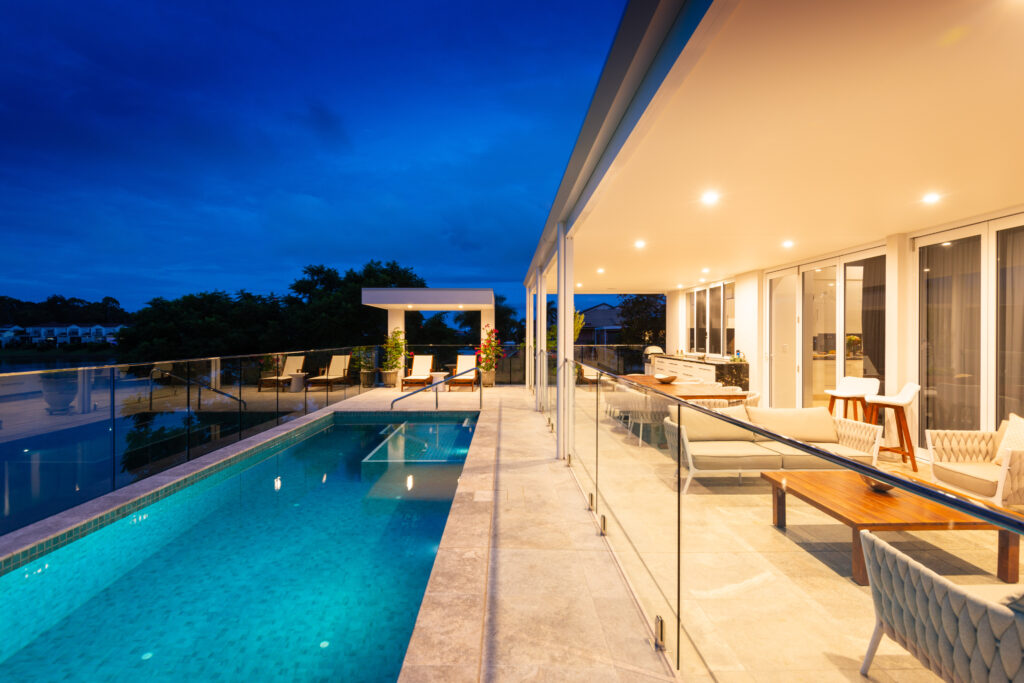 A steep embankment made development of the yard a challenge so the pool was elevated to match the height of the house. Archidiom Architects designed the expansion, seamlessly joining the pool and house with an outside entertainment area.