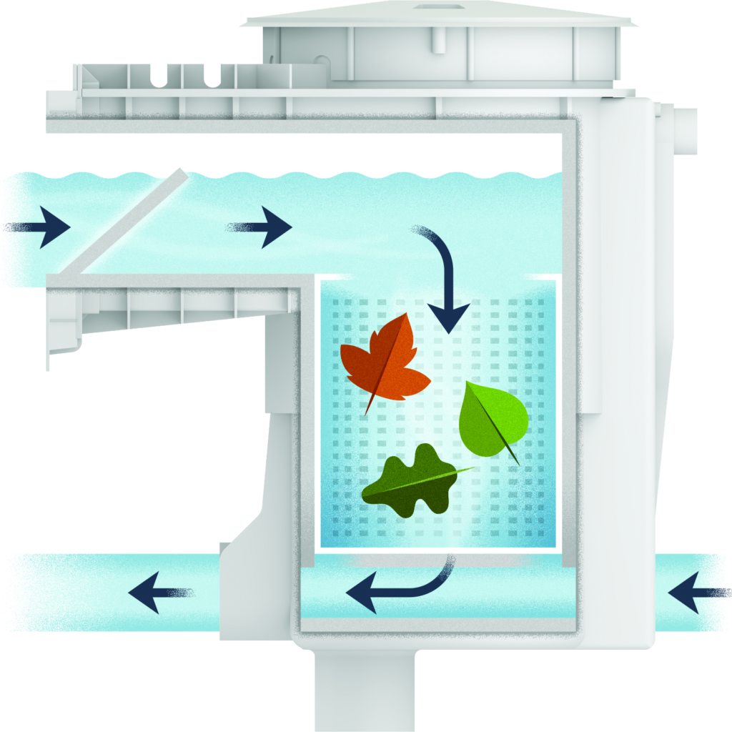 Debris is directed towards drain(s) at the lowest points of your pool for removal, then captured by leaf baskets and filters.